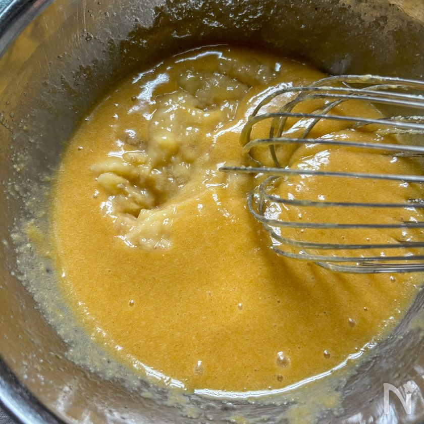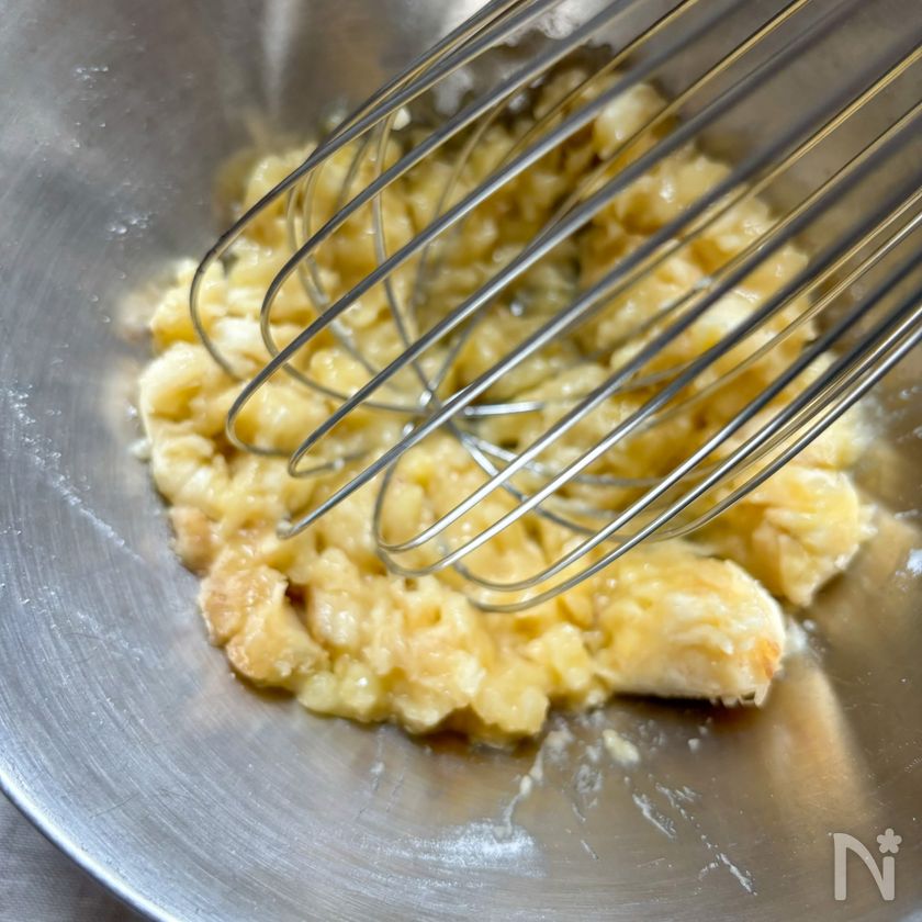 別のボウルで、バナナを泡だて器の先でつぶしておく。