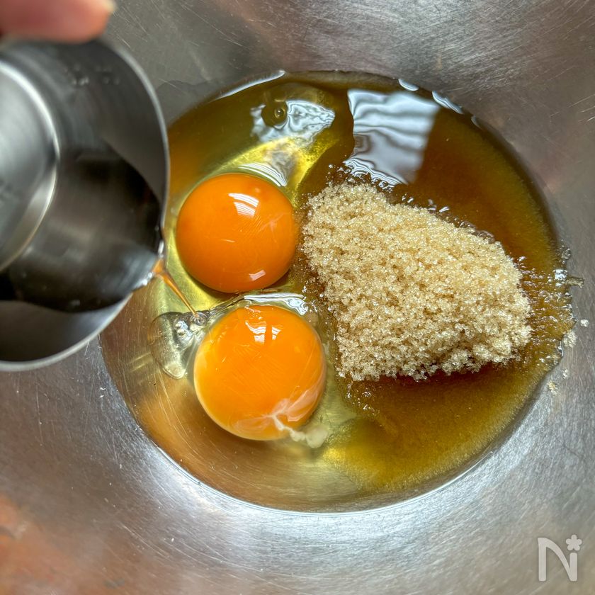 (2) ボウルに卵、砂糖を入れて泡だて器でよく混ぜる。