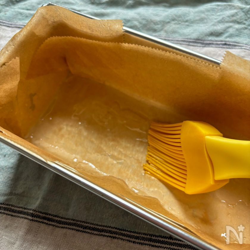 (下準備) パウンド型に合わせて内側にクッキングシートをしき、ココナッツオイルを薄くぬっておく。