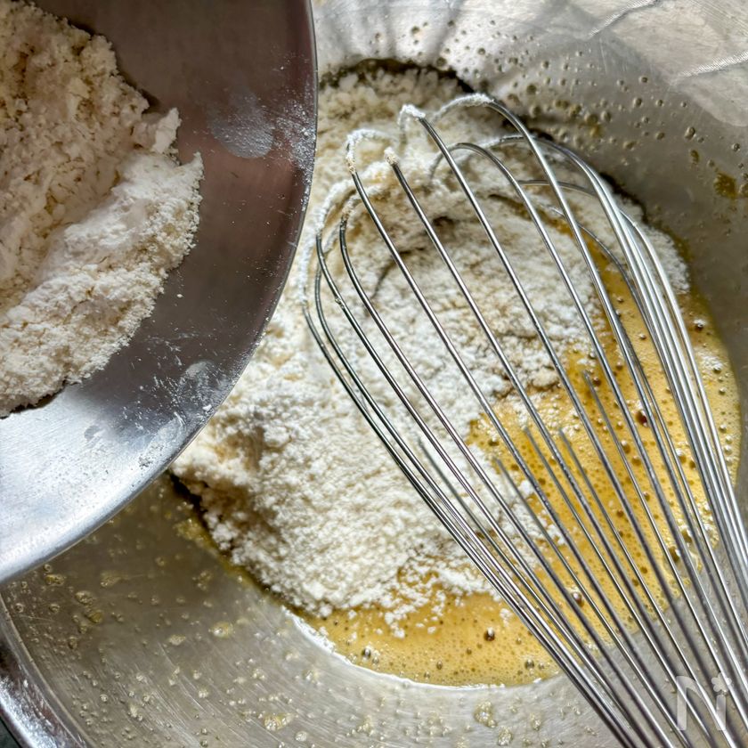 (3) 2に1でふるった粉類を加え、全体がなじんで粉っぽさがなくなる程度に泡だて器で軽く混ぜ合わせる。