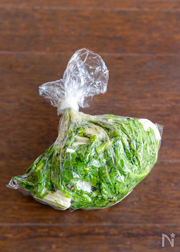(1) 大根は皮を剥いて3~5㎜のいちょう切りに、春菊は茎部分は薄い小口切りに、葉の部分は4㎝位に切りポリ袋に入れて、【A】も加えてよく揉み混ぜ、なるべく空気を抜いて口を縛り、一晩置いたら出来上がり。