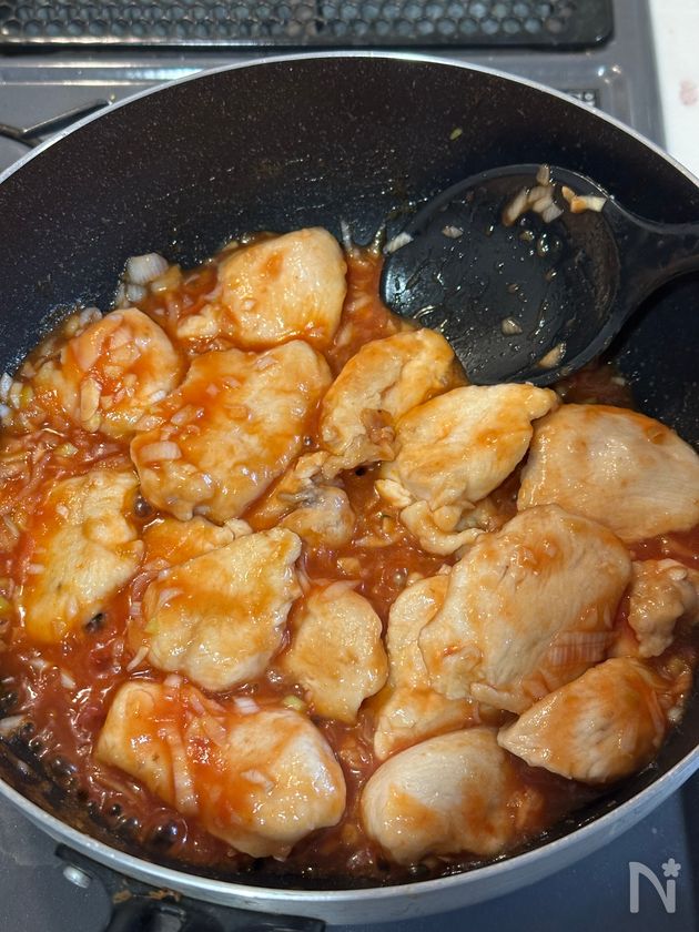(3) 鶏肉を戻し入れ、弱めの中火でソースを絡めながらさっと煮詰める。