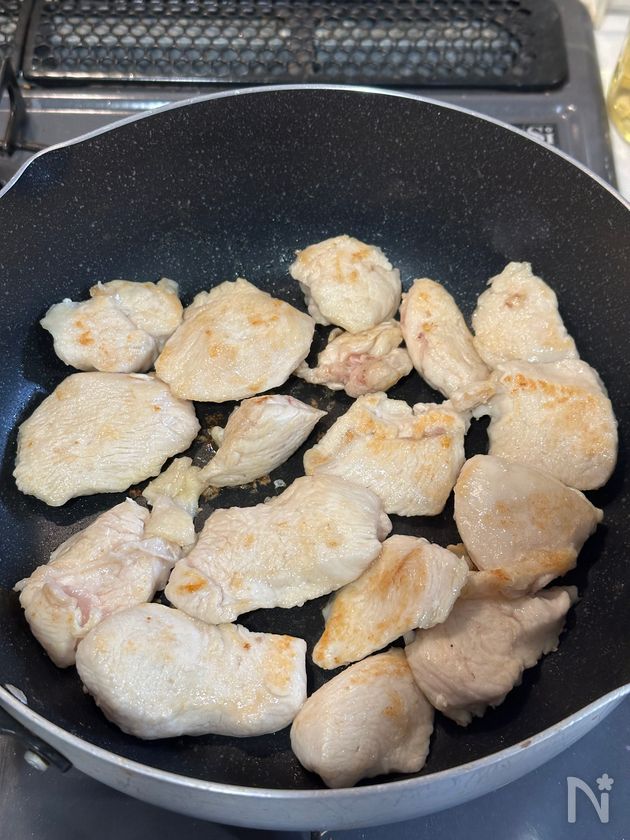 (1) フライパンにごま油を入れて中火で熱し、鶏むね肉を並べて両面に焼き色をつける。鶏肉に火が通ったら一度取り出す。