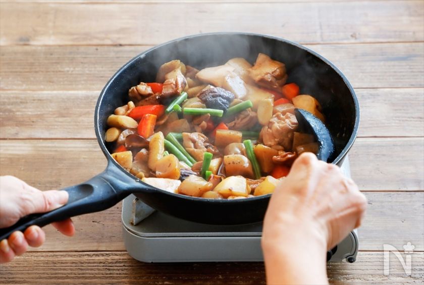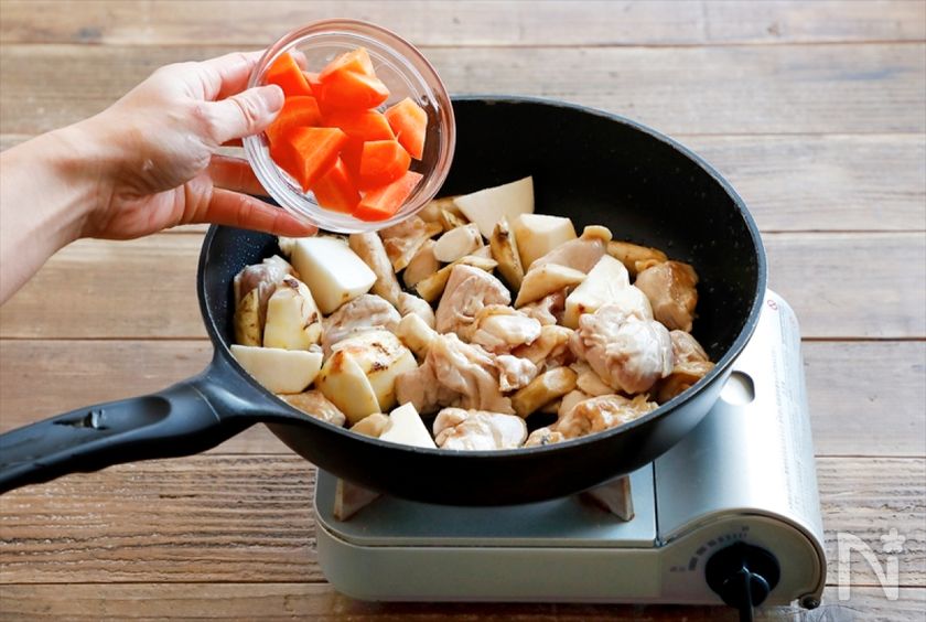 半分くらい火が通ってきたら里芋、ごぼう、にんじんを加えて炒める。