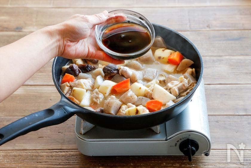だし汁を入れてアクを取り、【A】を入れて中火~弱火で10分くらい煮る。