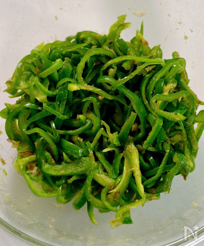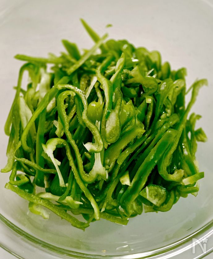 ・ピーマンは細切りにすることで味なじみもよく、加熱時間も短くすみます。