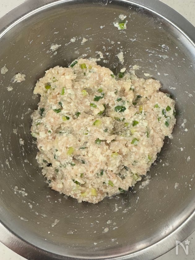 (1) ボウルに、鶏ひき肉、しっかり水分を拭いた木綿豆腐、【A】を入れ、しっかりまぜる。