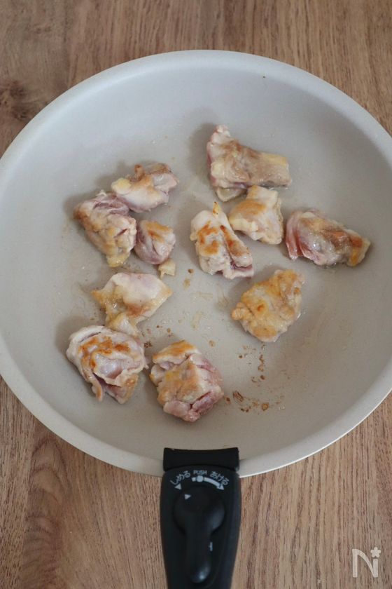 (2) 中火で熱したフライパンにサラダ油をひき、鶏モモ肉を入れ、焼き色がつくまで炒める。
