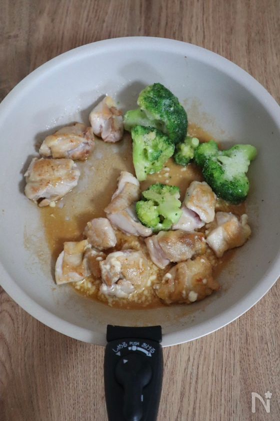 (3) 冷凍のままのブロッコリーと混ぜ合わせた【A】を加え、汁気を飛ばしながら鶏モモ肉にしっかり火が通るまで2〜3分煮絡める。
