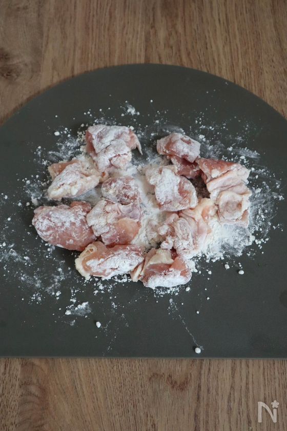 (1) 鶏モモ肉はひと口大より一回りぐらい大きめに切り、塩こしょう→薄力粉の順に全体にまぶす。
