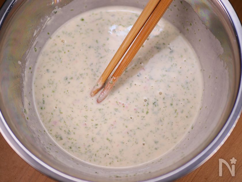 (3) 天ぷら粉は袋の表示通り作り(今回は天ぷら粉100g、水160mlで作りました)、【B】を加えて混ぜる。