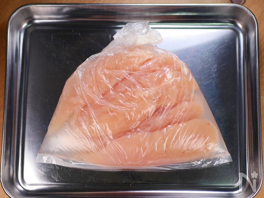 (2) ポリ袋に鶏ささみとブライン液【A】を入れ、30分以上漬ける。