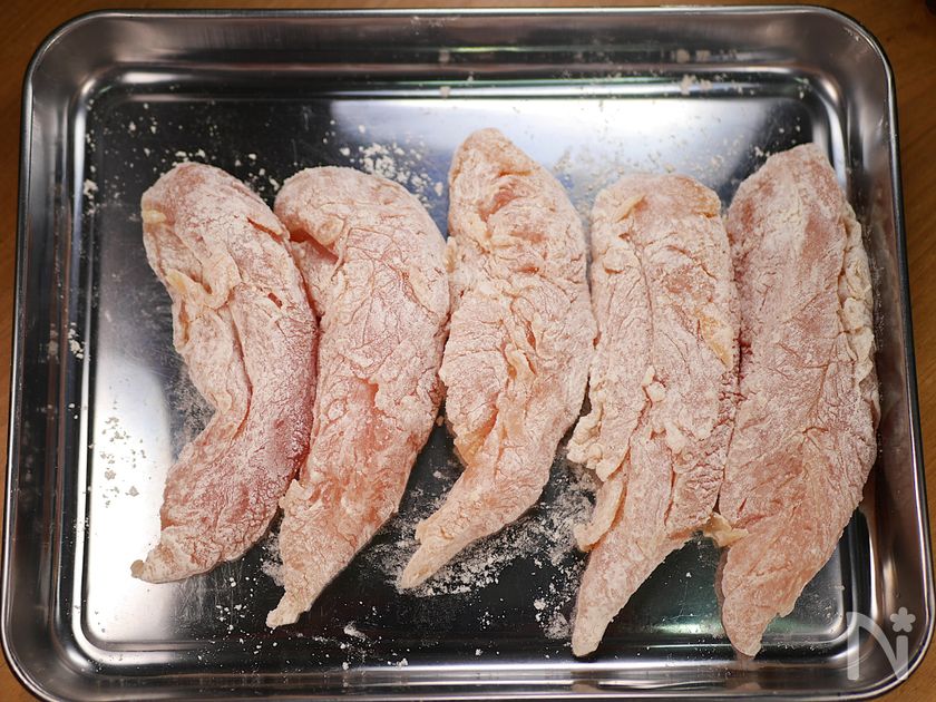 (4) 鶏ささみの水気をキッチンペーパーで押さえ、天ぷら粉をまぶし(打ち粉)、余分な粉を払う。