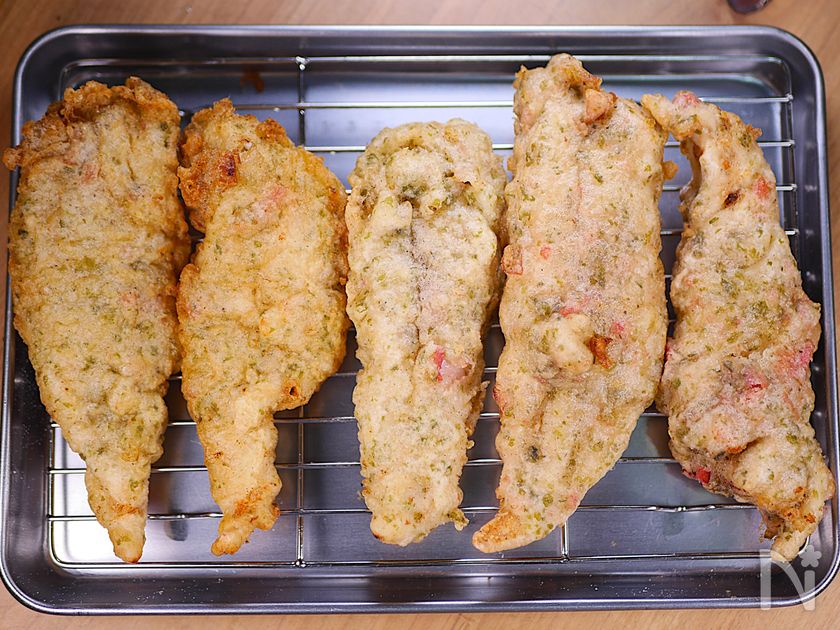 ⭕天ぷら粉に米粉を加えてサクサク感を高め、冷めても美味しくしました♪