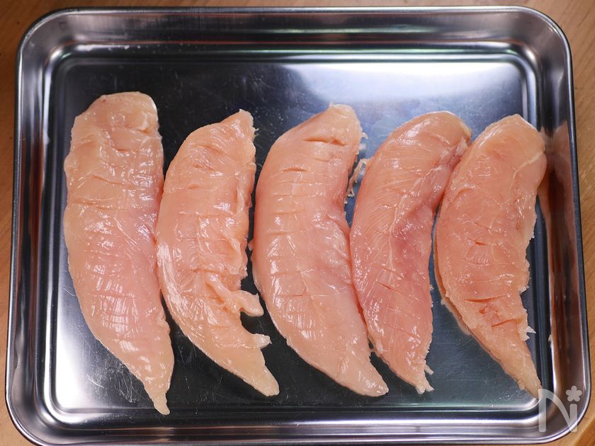 (1) 鶏ささみは白い筋を取り除き、横全体に包丁の角で軽く叩いて切れ込みを入れる。