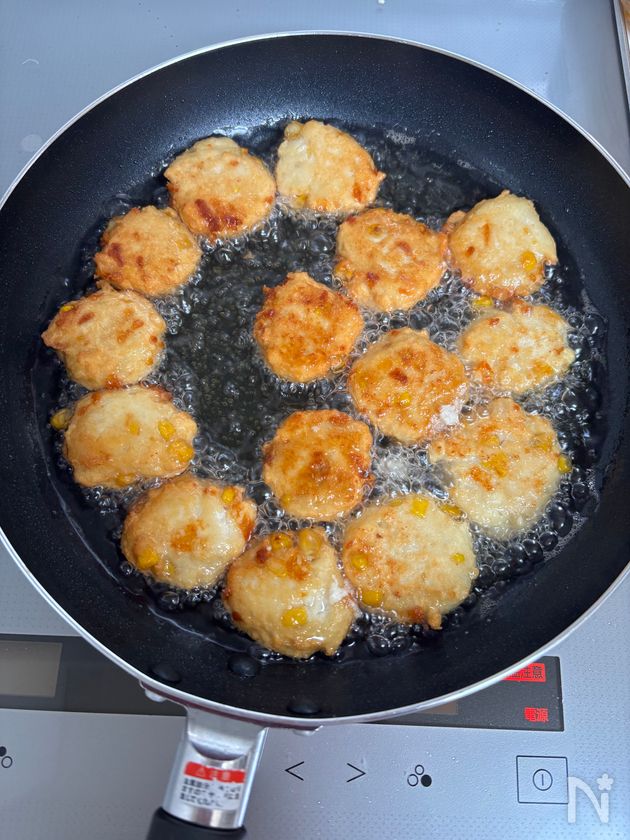 ①をスプーンで少量ずつ形を整えながら加え、両面こんがりするまで揚げ焼きする。