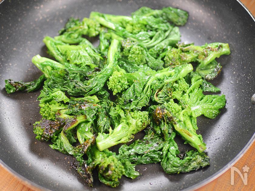 (3) 続けて、サラダ油(大さじ1弱)をひき、菜の花に塩ひとつまみ(分量外)を振り、強めの中火で軽く焼き色をつけたらフタをし、弱火で約3分蒸し焼きにする。