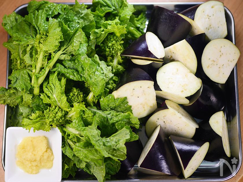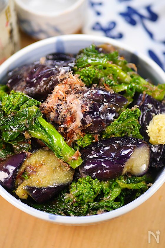 菜の花のおいしい食べ方😋なすと菜花の生姜おかかめんつゆ和え