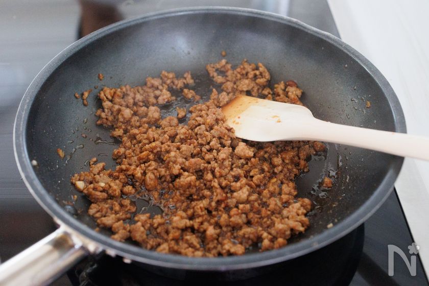 フライパンを中火で熱し、豚ひき肉をほぐしながら炒める。【A】を加えて炒め、さらに【B】を加えて汁気がなくなるまでよく炒める。