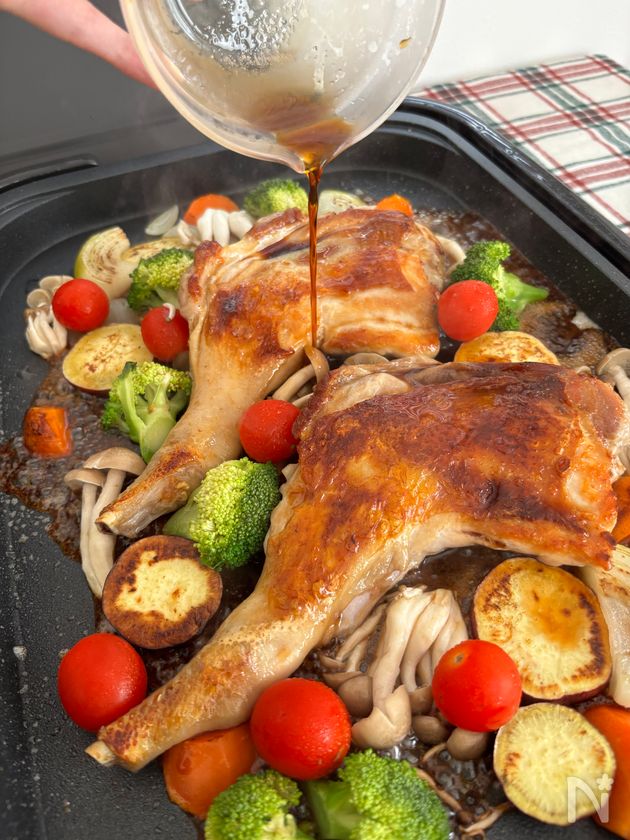 (3) 【A】を合わせてたれを作る。たれを全体にまわしかけたらふたをして、温度調節ダイヤルを180に設定して、10分蒸し焼きにする。