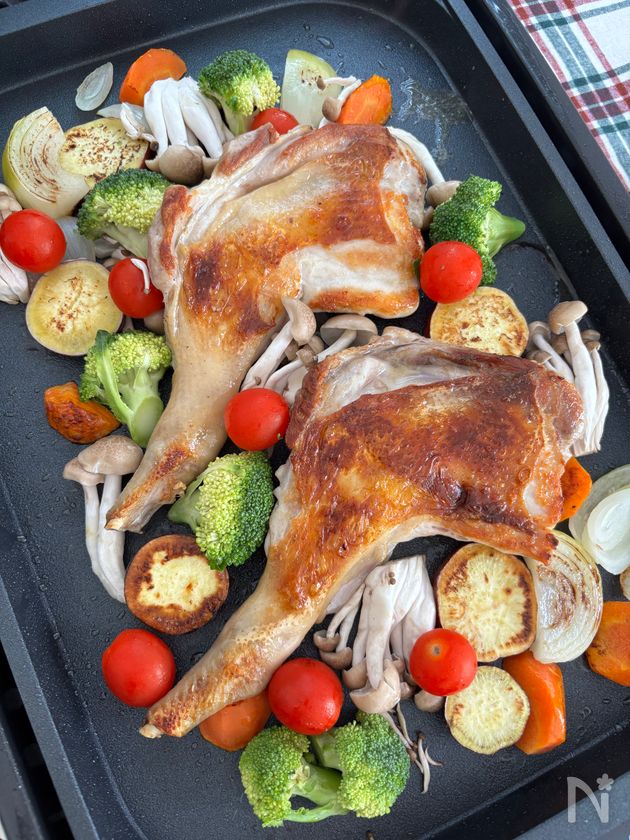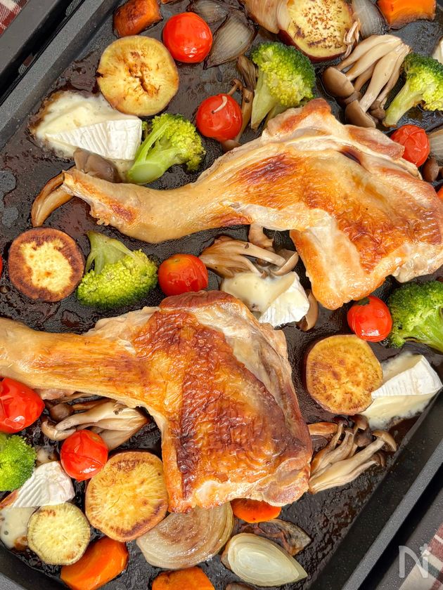 (2) 皮目がパリッと焼けたら裏返してさらに3分焼く。野菜、きのこ類をすべて加えて並べ、焼き目をつける。