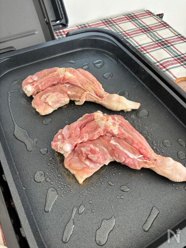 (1) 骨付き鶏もも肉の両面に塩、こしょうをふる。ホットプレートの温度調節ダイヤルを230に設定し、オリーブオイルを広げて、鶏肉を皮目から並べて焼く。