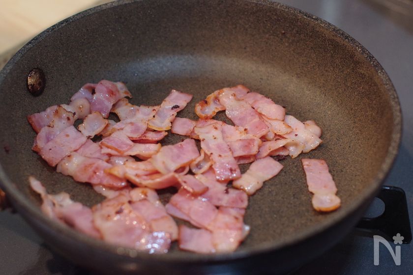 (2) じゃがいもを加熱している間にハーフベーコンを1cm幅に切って、油をひいたフライパンで炒める。