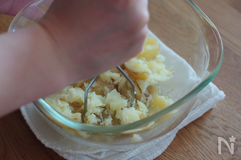 (3) 熱いうちに新じゃがを粗めに潰す。