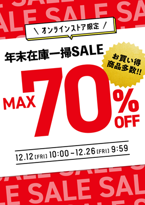 ABCマートは、2025年12月12日10時から26日9時59分までの期間、最大70%オフの「年末在庫一掃SALE」を公式オンラインストアで開催中です。