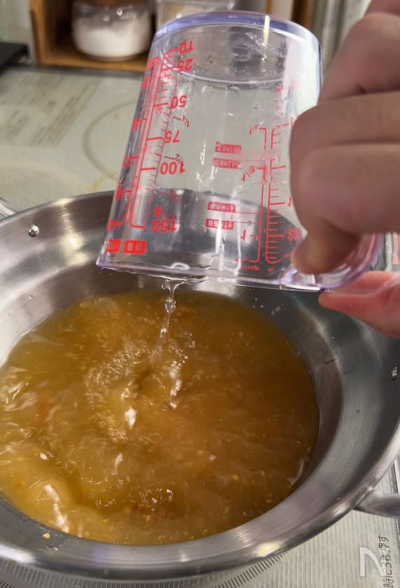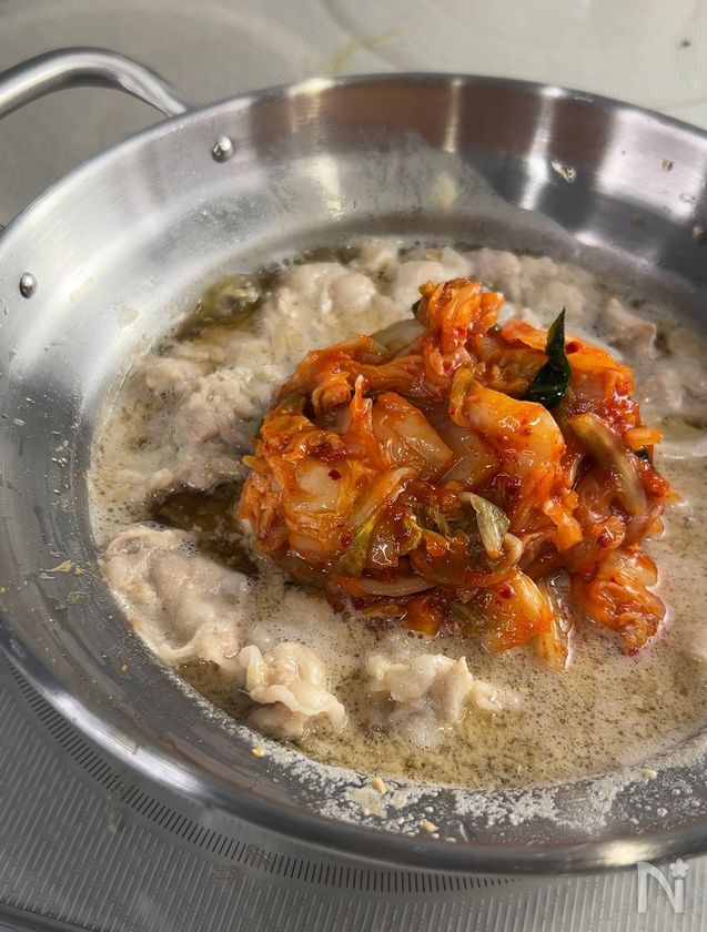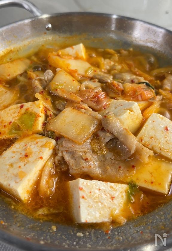 (2) 肉の色が変わったら、キムチと豆腐を入れて、10分煮込む。
