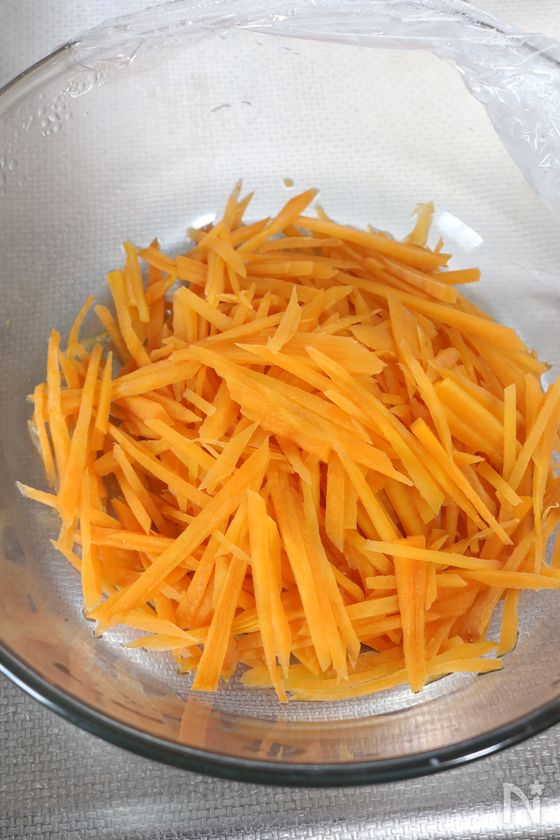 (1) にんじんは皮を剥き細切りする。