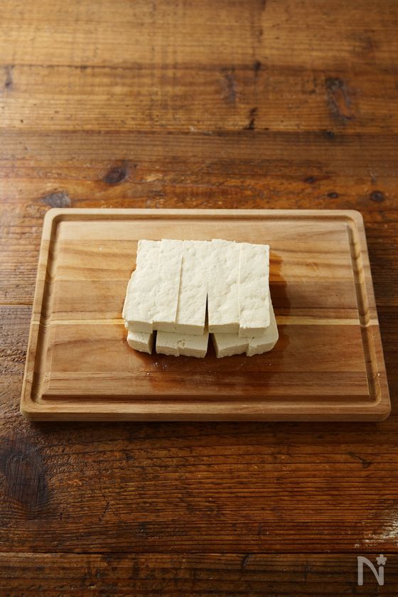 (下準備) 木綿豆腐は3枚重ねのペーパータオルで包みそのまま10分置き水を切る。半分の厚さに切り重ねたまま横に置き更に5等分の幅に切る。