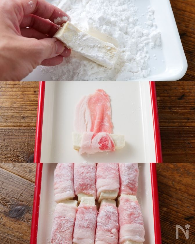 ・豆腐全体に片栗粉をしっかりまぶし、豚肉ですき間ができないように巻きます。