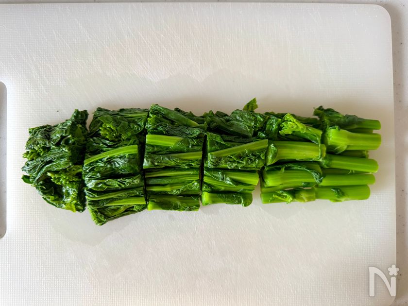 (2) 菜の花は沸騰した湯に茎側から入れて1分15秒ほど茹でて水に取って冷まし、水気を軽く絞る。4cm長さにカットする。
