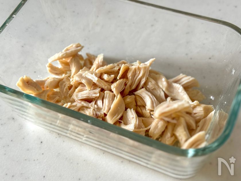(1) ささみは耐熱容器に並べ、フォークで数カ所穴をあけ【A】をふり、満遍なく行き渡らせる。ふんわりラップをかけて600Wの電子レンジで1分半、上下を返して1分加熱する。ラップをとって粗熱をとり、手で細かくさく。