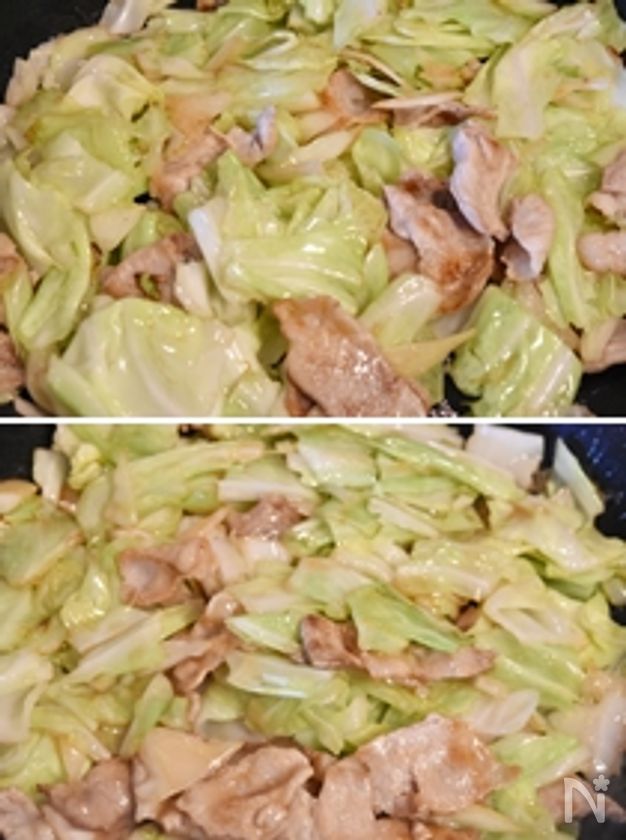 (3) ②に春キャベツを入れ、しんなりするまで強火で炒め、