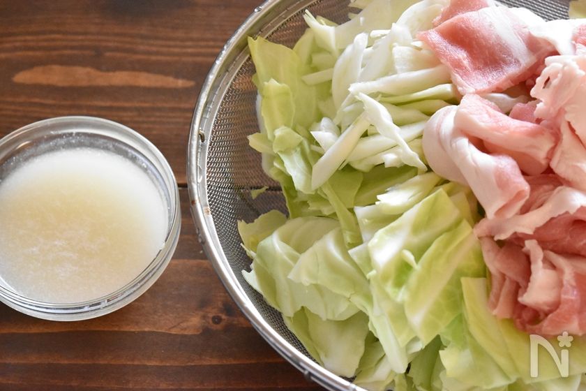 (1) 豚バラ薄切り肉は5㎝幅に切り、春キャベツはザク切り、【A】を混ぜ合わせる。
