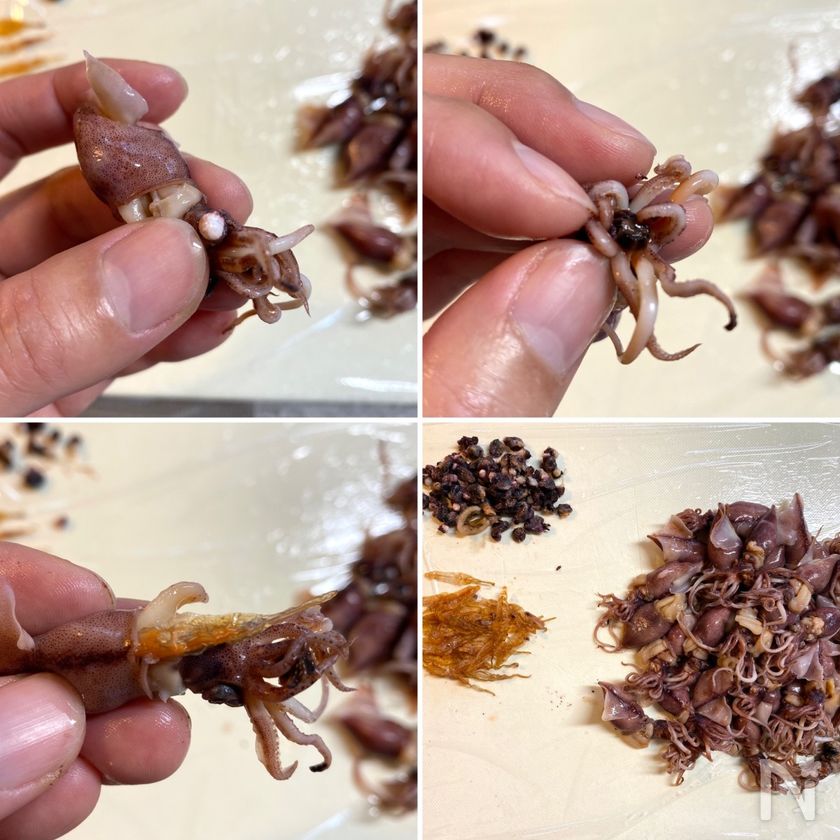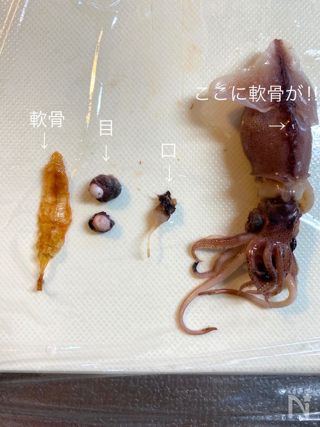 白い目と、足の間にある固いくちばしを手で取り除く。身の内側にあるプラスチックのような固い軟骨を手でスーッと抜き取る。