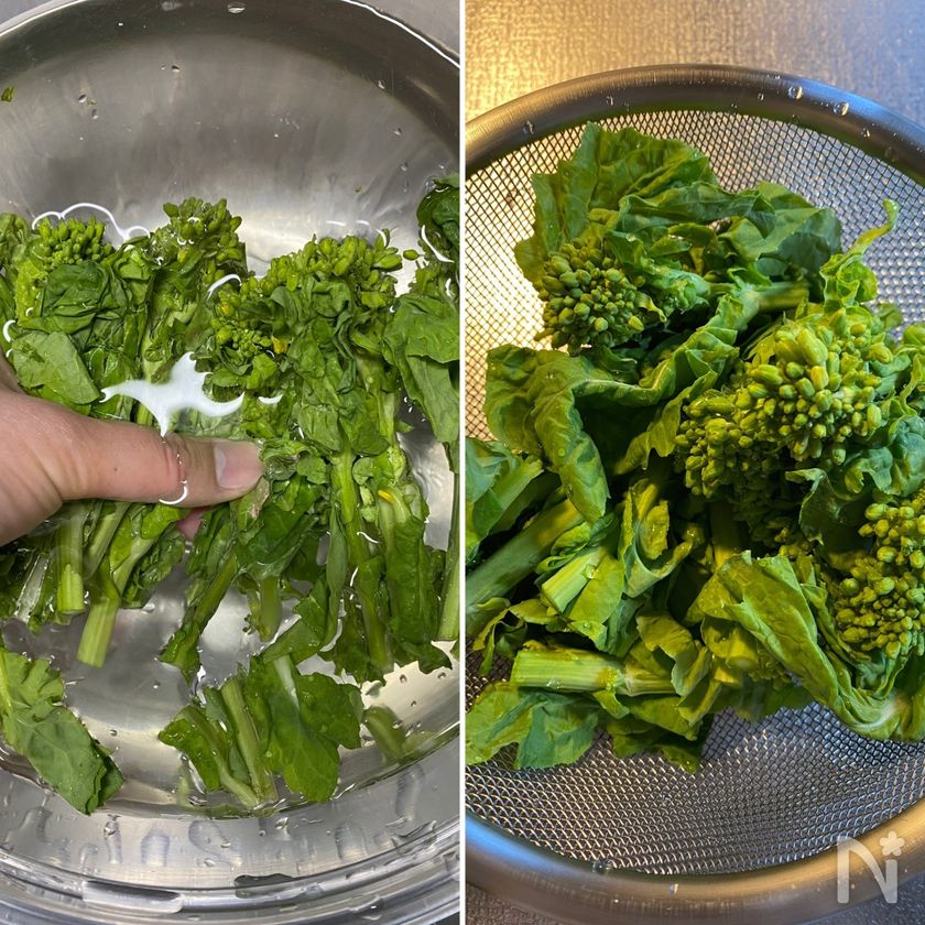 (2) 菜の花は水を張ったボウルで丁寧に洗い、根元を5mmほど切り落とし、半分の長さに切る。茎部分が太い場合厚さを半分にする。