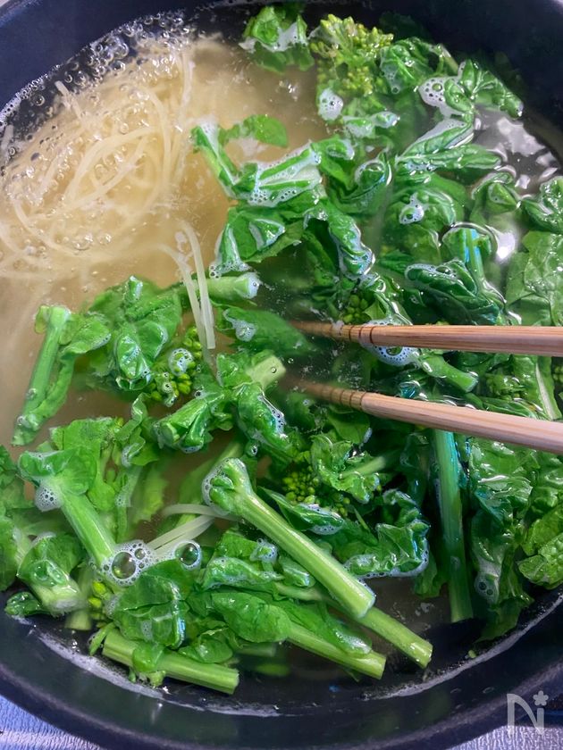 (7) スパゲッティの茹であがり1分前になったら菜の花を加え、スパゲッティと一緒に茹でる。茹で上がったらざるに上げて湯切りする。