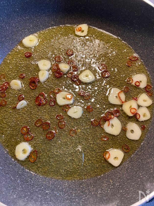 (5) フライパンにオリーブオイルとにんにくを入れて弱火にかけ、にんにくの香りが立ってきたら鷹の爪(赤唐辛子)を加える。