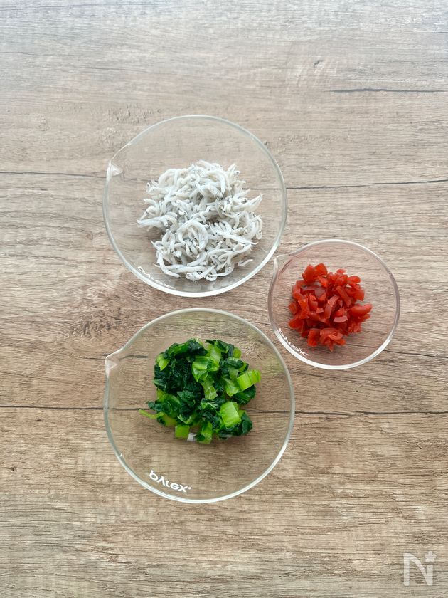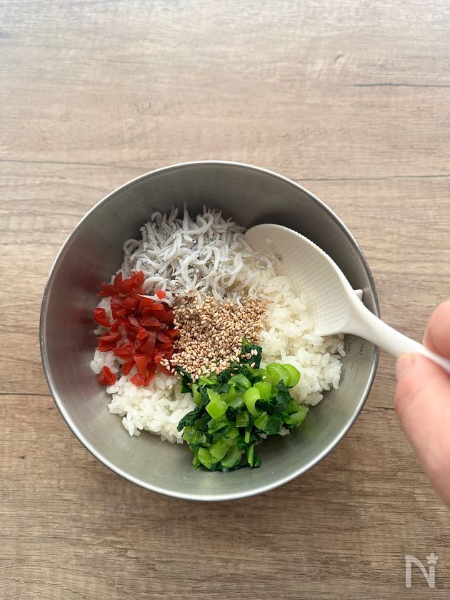 (3) 1の酢飯にカリカリ梅、小松菜、しらす、白いりごまを加えて混ぜ合わせる。