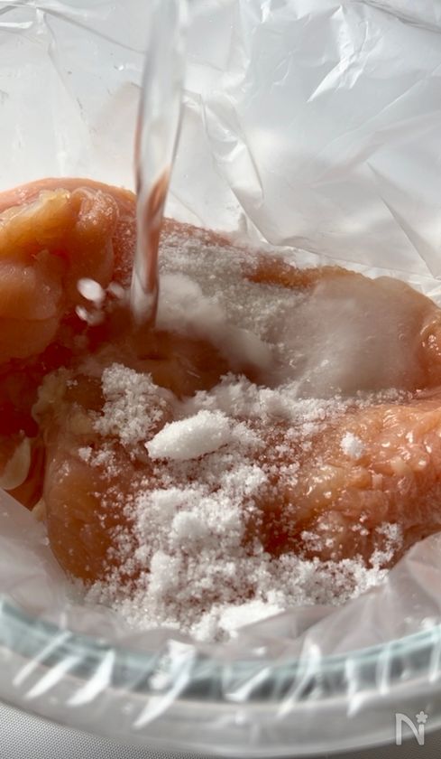 (2) 鶏むね肉をポリ袋に入れ、【A】を加えます。