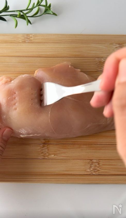 ・むね肉はフォークでしっかり穴を開けると、味が入りやすくしっとり仕上がります。