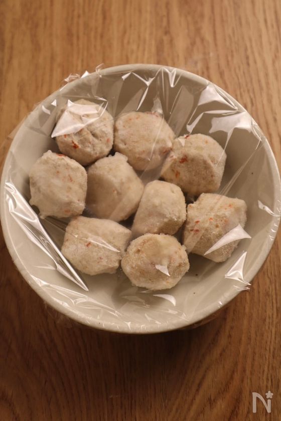 (1) 耐熱皿にかに風味つみれを入れ、ラップをして電子レンジ(500W)で約4分加熱する。