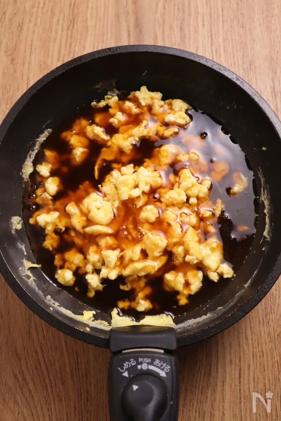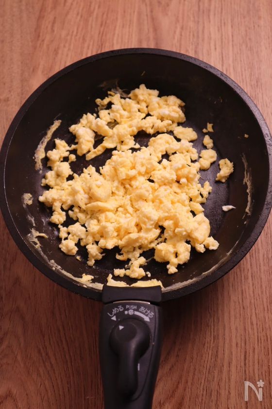 (2) フライパンにサラダ油を熱し、混ぜ合わせた【A】を入れ、かき混ぜながらふんわり炒める。