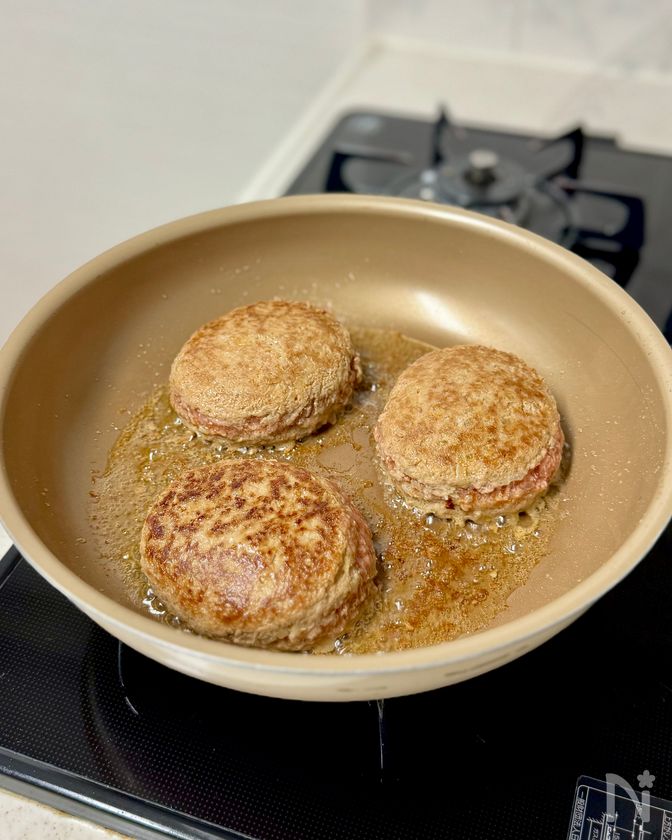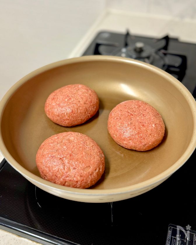 (4) フライパンを中火にかけサラダ油をひき、成型し直しながら、ハンバーグを並べる。