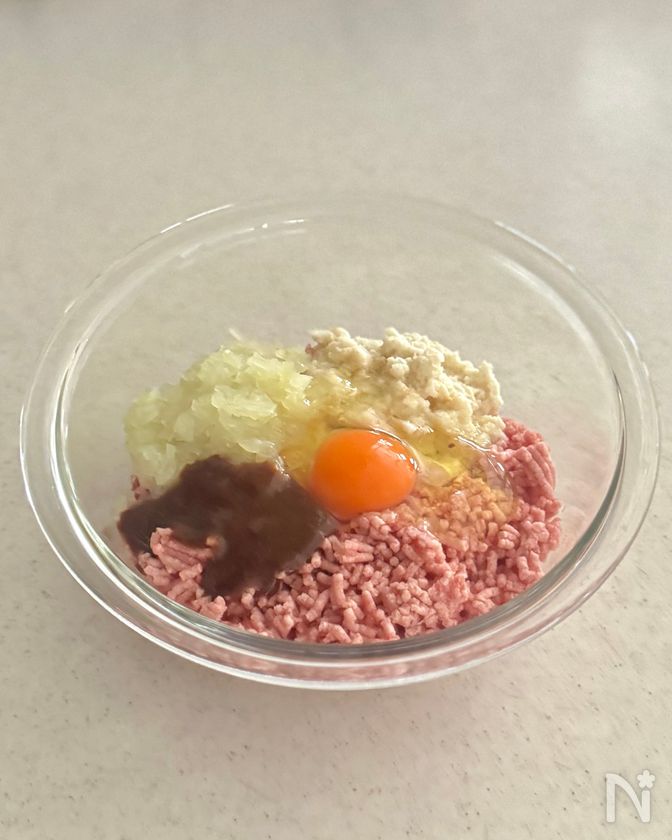 (1) 玉ねぎはみじん切りにし、600Wのレンジで2〜3分加熱して粗熱を取る。パン粉を牛乳に浸しておく。
