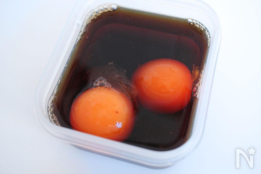 (3) 黄身がちょうど入る容器に入れて、しょうゆとみりんを黄身が浸かるまで入れる。
