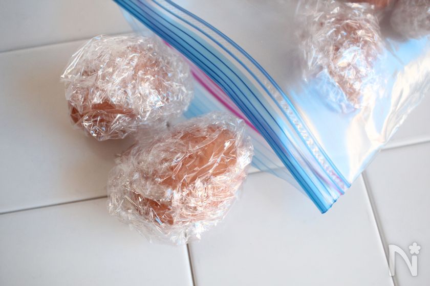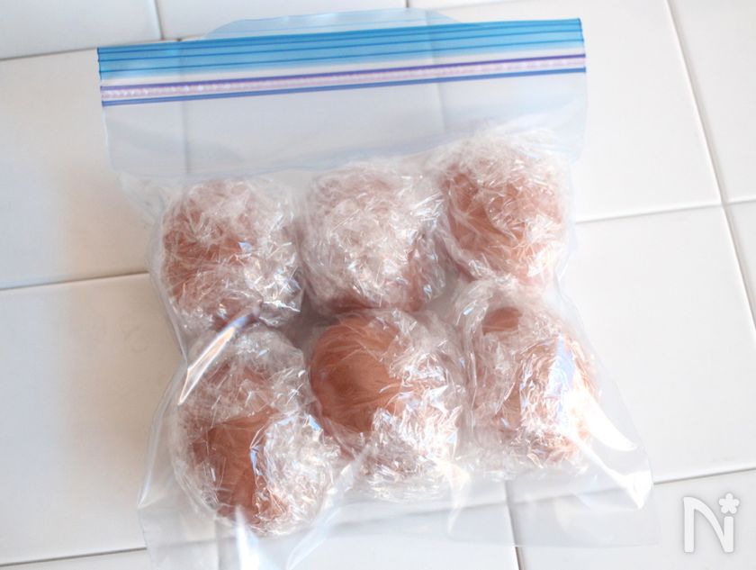 (下準備) 卵を殻ごと丸ごとラップで包み、冷凍用の保存袋に入れて冷凍する。凍るのに時間がかかるので、丸1日以上冷凍する。
